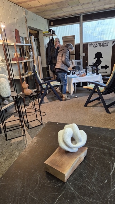 Bilder malen, Stein- + Holzbildhauen, Ton + Wachs modellieren, Kaffee / Tee trinken und gemütliches Zusammensein, usw. Gerne könnt Ihr uns im Atelier besuchen